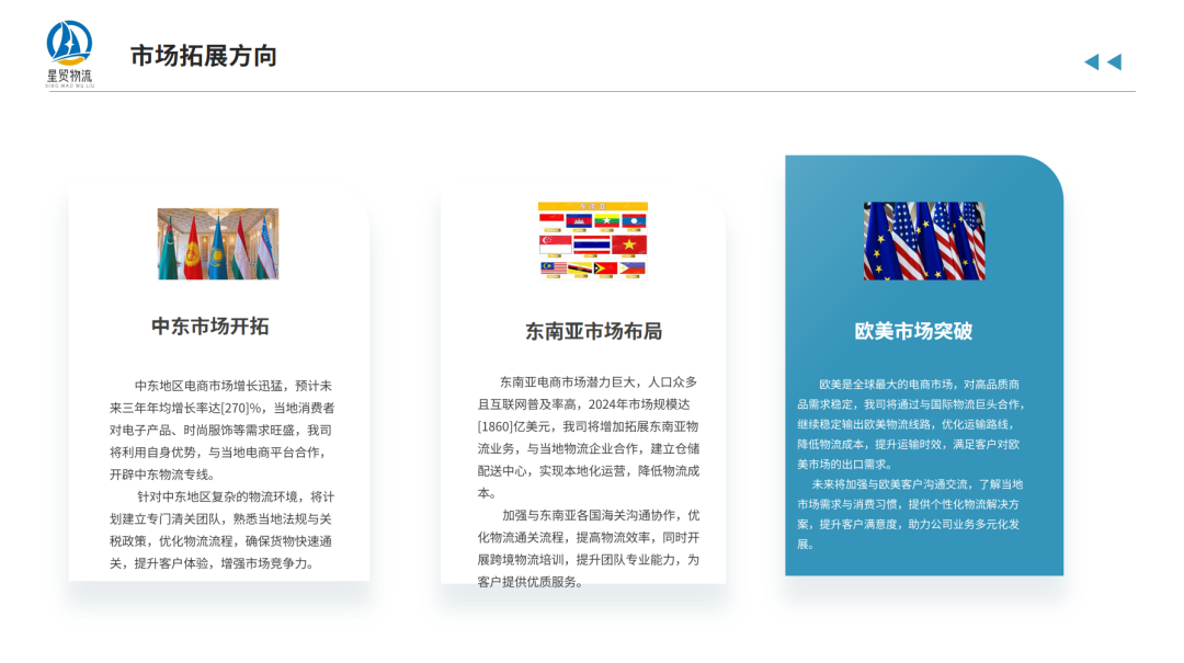 在中东、东南亚、欧美等目标市场建立海外仓,仓储、派送一体化,与当地合作伙伴共同投资建设,预计三年内新增[10]个国际仓储揽收点,提升公司在国际市场的物流服务能力。